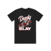 This shirt is a satire NASCAR shirt. Dusty used to wear a lot of NASCAR t-shirts growing up and he always wanted one of his own. Now he has a new one! The shirt has Dusty's jokes listed as the sponsors and his hand is waving out the window! You gotta wear this shirt!